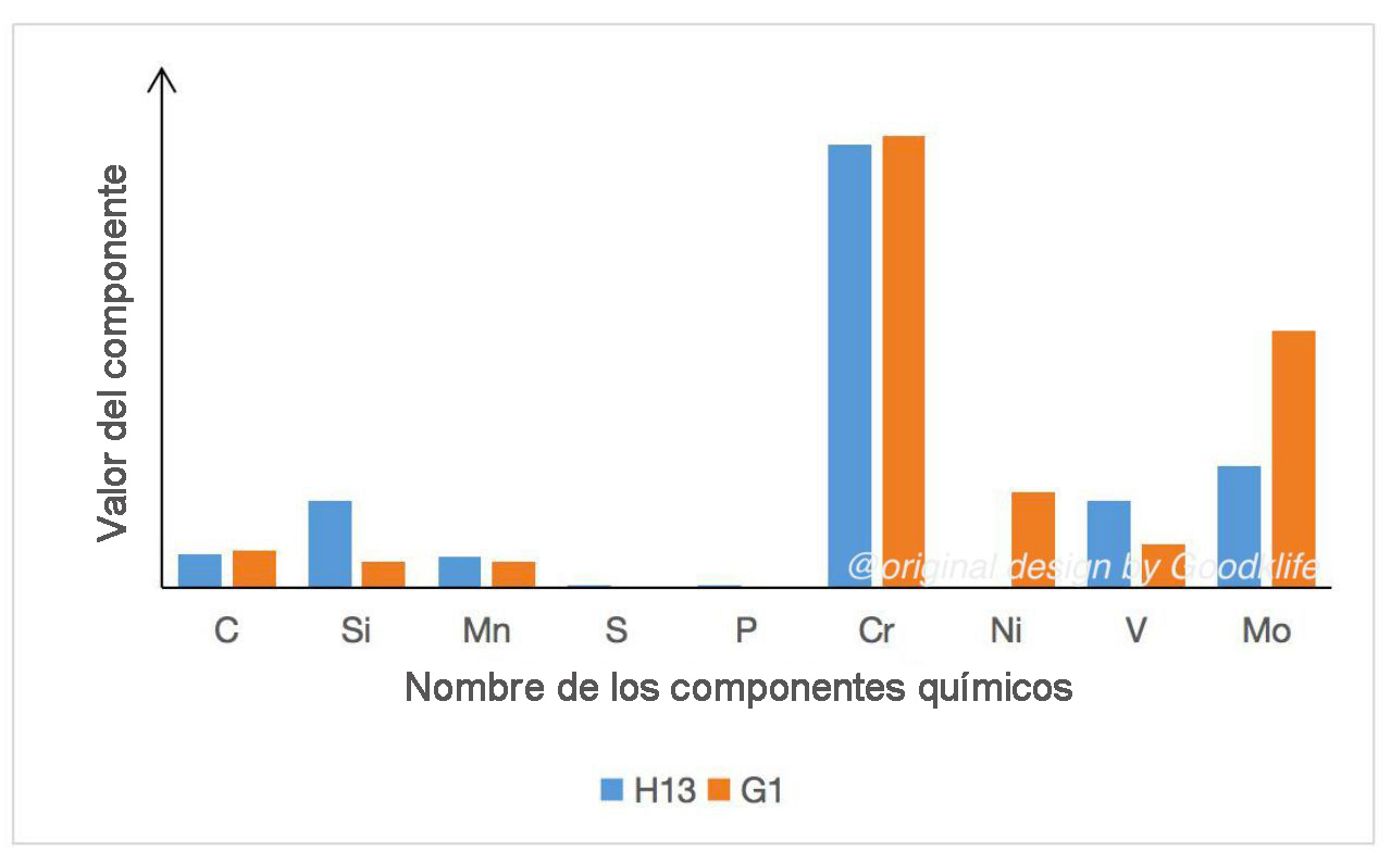 Sin embargo, con el rápido desarrollo de la industria de procesamiento de metales, la resistencia al desgaste del H13 ya no cumple con los requisitos. Además, el H13 no soporta condiciones de cizallamiento a altas temperaturas, y las cuchillas a menudo dejan de ser utilizables debido a la caída de dureza. Por ello, Goodklife, en colaboración con profesores universitarios, desarrolló el acero para herramientas de alta aleación G1, patentado nacionalmente. Este material resuelve los problemas de resistencia al desgaste y al calor insuficientes del H13. Figura 1 muestra la diferencia en la composición química entre el G1 y el H13. El G1 es un acero para herramientas de alta aleación refinado por ESR (reelectroescoria). El contenido de P y S en G1 es extremadamente bajo, por debajo de 0,0025, mientras que G1 contiene más W y Ni, lo que aumenta la resistencia al desgaste y la tenacidad.
